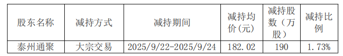 2025年9月22日至2025年9月24日,泰州通聚通過大宗交易方式減持190萬股股份,減持均價為182.02元,減持比例1.73%。經(jīng)計算,泰州通聚套現(xiàn)約3.46億元。