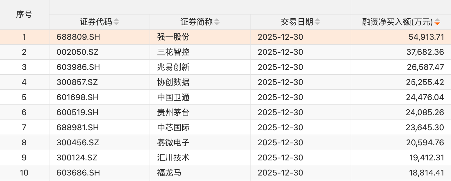 個(gè)股方面,37只個(gè)股獲融資凈買入額超1億元。強(qiáng)一股份獲融資凈買入額居首,凈買入5.49億元;融資凈買入金額居前的還有三花智控(002050)、兆易創(chuàng)新(603986)、協(xié)創(chuàng)數(shù)據(jù)(300857)、中國衛(wèi)通(601698)、貴州茅臺(tái)(600519)、中芯國際、賽微電子(300456)、匯川技術(shù)(300124)、福龍馬(603686)等。