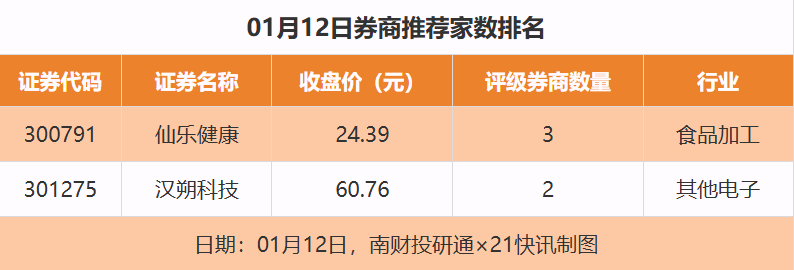 從券商推薦家數(shù)來看,1月12日有22家上市公司得到券商推薦,其中仙樂健康獲得3家推薦,漢朔科技獲得2家推薦,海瀾之家(600398)等獲得1家推薦。