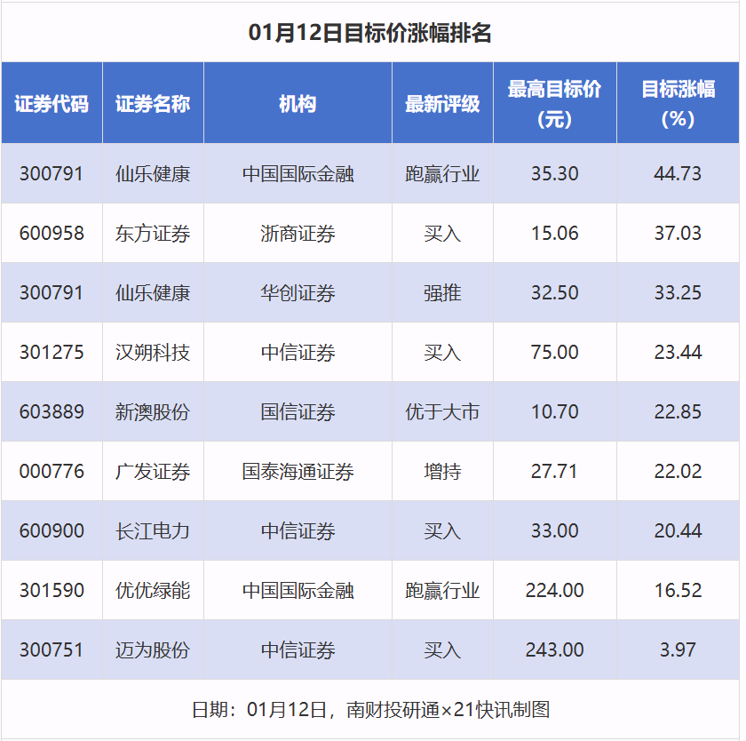 南財(cái)投研通數(shù)據(jù)顯示,1月12日,券商給予上市公司目標(biāo)價(jià)共9次,按最新收盤價(jià)計(jì)算,目標(biāo)價(jià)漲幅排名居前的公司有仙樂健康(300791)、東方證券、漢朔科技(301275),目標(biāo)價(jià)漲幅分別為44.73%、37.03%、23.44%,分別屬于食品加工、證券、食品加工行業(yè)。