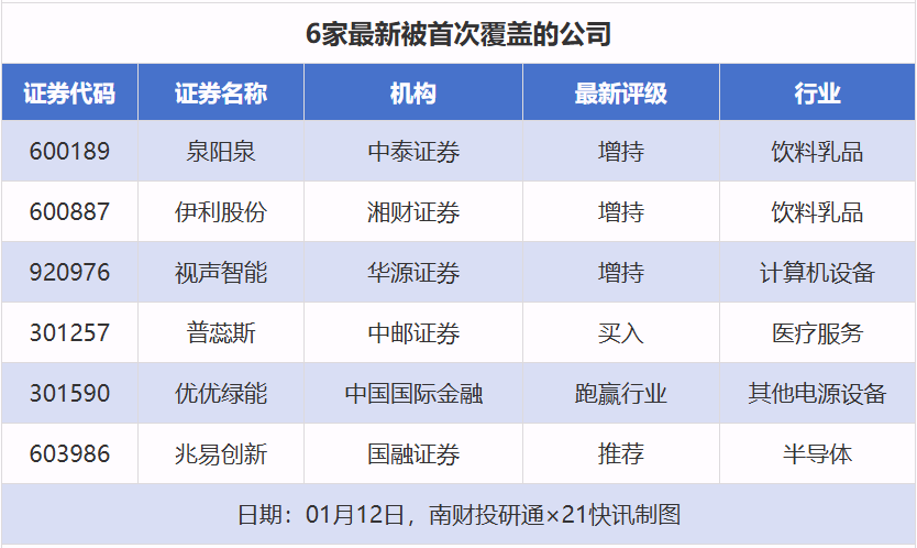 首次覆蓋方面,1月12日券商共給出了6次首次覆蓋,其中泉陽泉(600189)獲得中泰證券(600918)給予“增持”評級,伊利股份(600887)獲得湘財(cái)證券給予“增持”評級,視聲智能獲得華源證券給予“增持”評級,普蕊斯(301257)獲得中郵證券給予“買入”評級,優(yōu)優(yōu)綠能(301590)獲得中國國際金融給予“跑贏行業(yè)”評級。