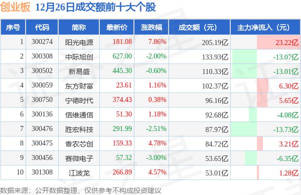 當(dāng)日創(chuàng)業(yè)板成交額前10大個股中6只個股收漲,平均漲幅3.32%,其中陽光電源(300274)以成交額205.19億元排第一。從主力資金流入看,成交額前10大個股中有5只個股呈現(xiàn)主力資金凈流入。